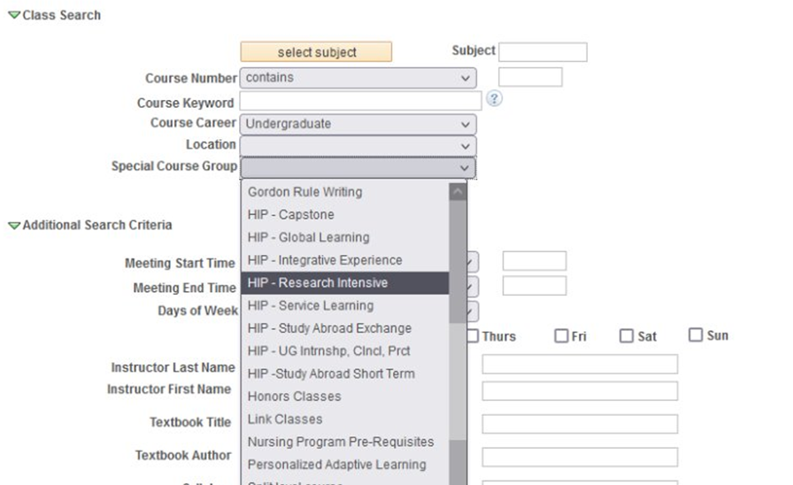 How to Enroll: You enroll in a Research-Intensive course the same way you’d enroll in any other course. In the course catalog, you can even search for the Research-Intensive courses that will be available in a given semester: go to “Special Course Group” and select “HIP – Research Intensive” from the drop-down menu.